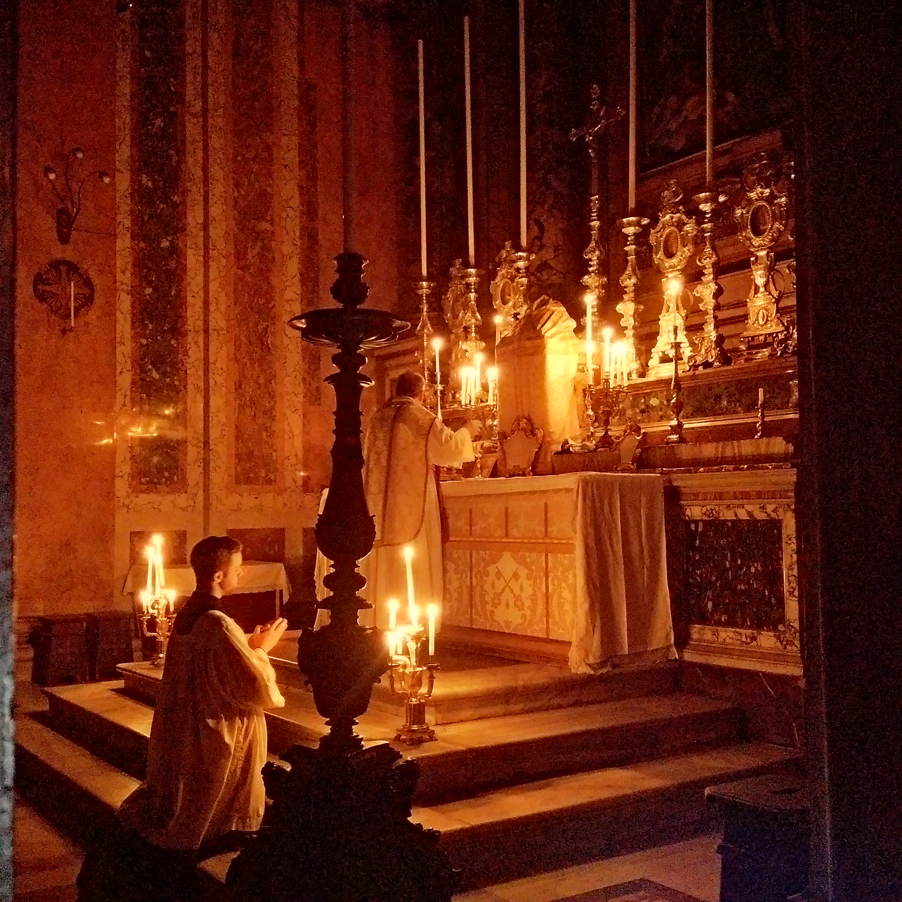 I know views from the sacristy can be enchanting, but this one tops the charts. A strange course of events led to a lack of power today at the Church! But that’s no problem. It only means we needed more candles! Enjoy the picture of this seemingly early ‘Rorate’ Mass!