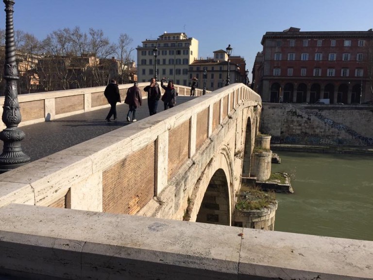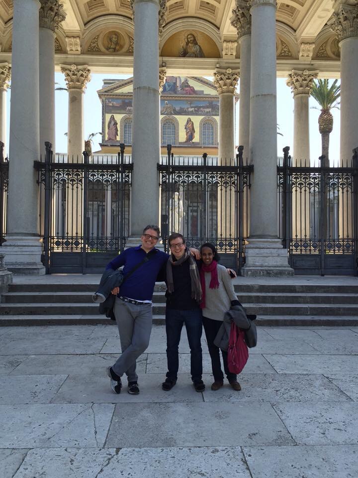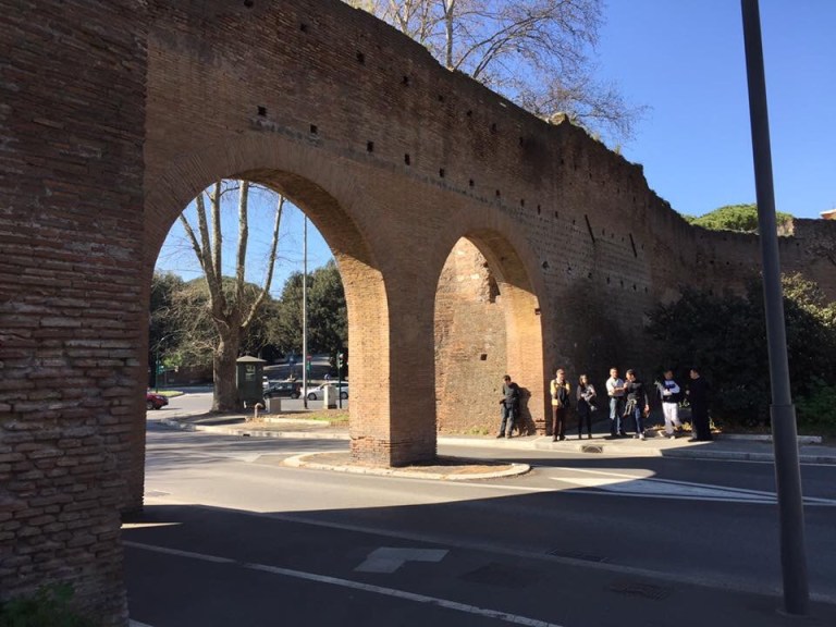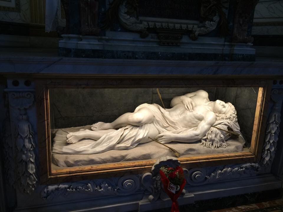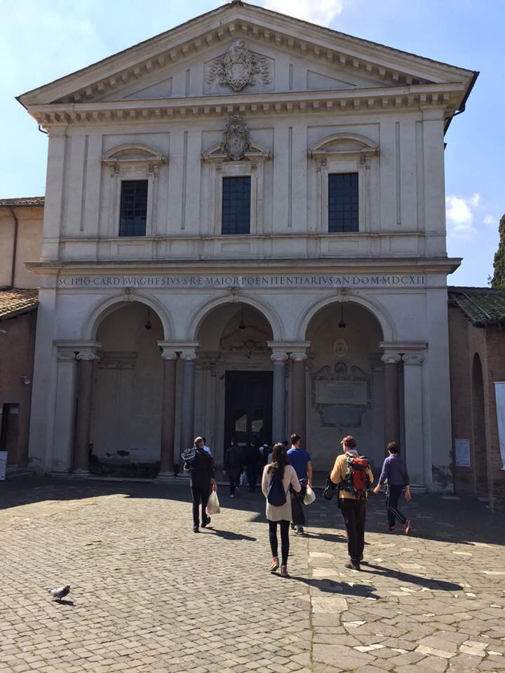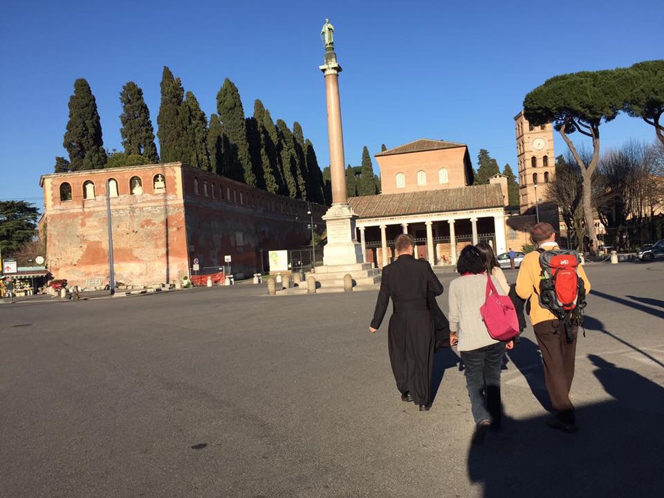 After the Mass and the group’s quick breakfast, I caught up with them (the life of the sacristan…). We began the longest journey to Saint Paul’s Outside the Walls. We visited Saint Paul’s tomb and then the Crucifix which spoke to Saint Bridget. We continued then on the Via delle Sette Chiese (aptly named) towards Saint Sebastian’s Basilica on the Via Appia. This gave us the opportunity to enjoy the beautiful weather as we walked through the fields above the catacombs. We ate a picnic lunch after the visit to the basilica.