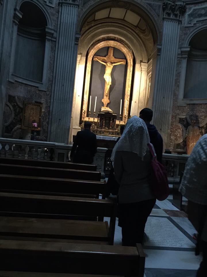 After the Scala Santa, we walked in silence to the Church of the Holy Cross in Jerusalem, the Calvary of Rome. We were able to prepare ourselves for Holy Week in meditating on the Via Crucis, beholding the True Man Who bore the Cross from the place of His condemnation to Calvary. The Church is also named ‘in Jerusalem’ because soil was brought from the Holy Land to be the foundation of the Church, to localize the Church upon the same earth Our Lord was crucified.