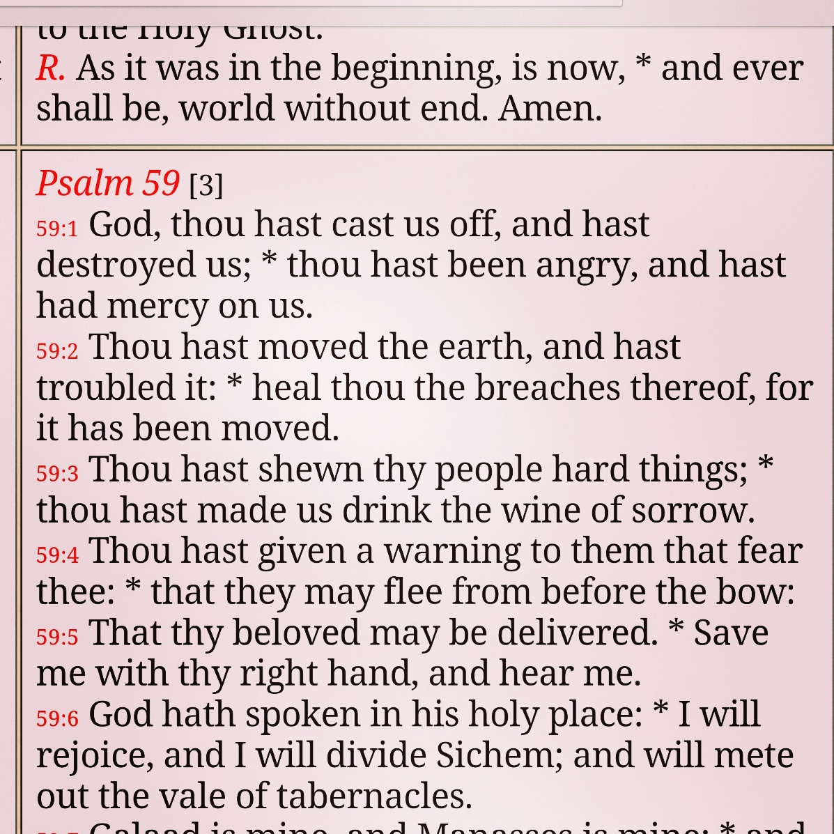 Today in None which is part of the prayers of the Church, the Divine Office, we came across Psalm 59. I was praying this Psalm and couldn’t help but think of the state of the Church and the world. It seems everything is turned away from God. It seems the earth is crying out. We can only go so far in denying God the rightful worship due to Him, the honor that we should give to His Majesty, the love we are to show in every aspect of our life. The disobedience, the blasphemies, the unspeakable immodesties against nature of contraception, immoral relations both natural and unnatural (from which even the demons flee once the temptation has taken root!!!). When will we stop and cry out to our Merciful God?