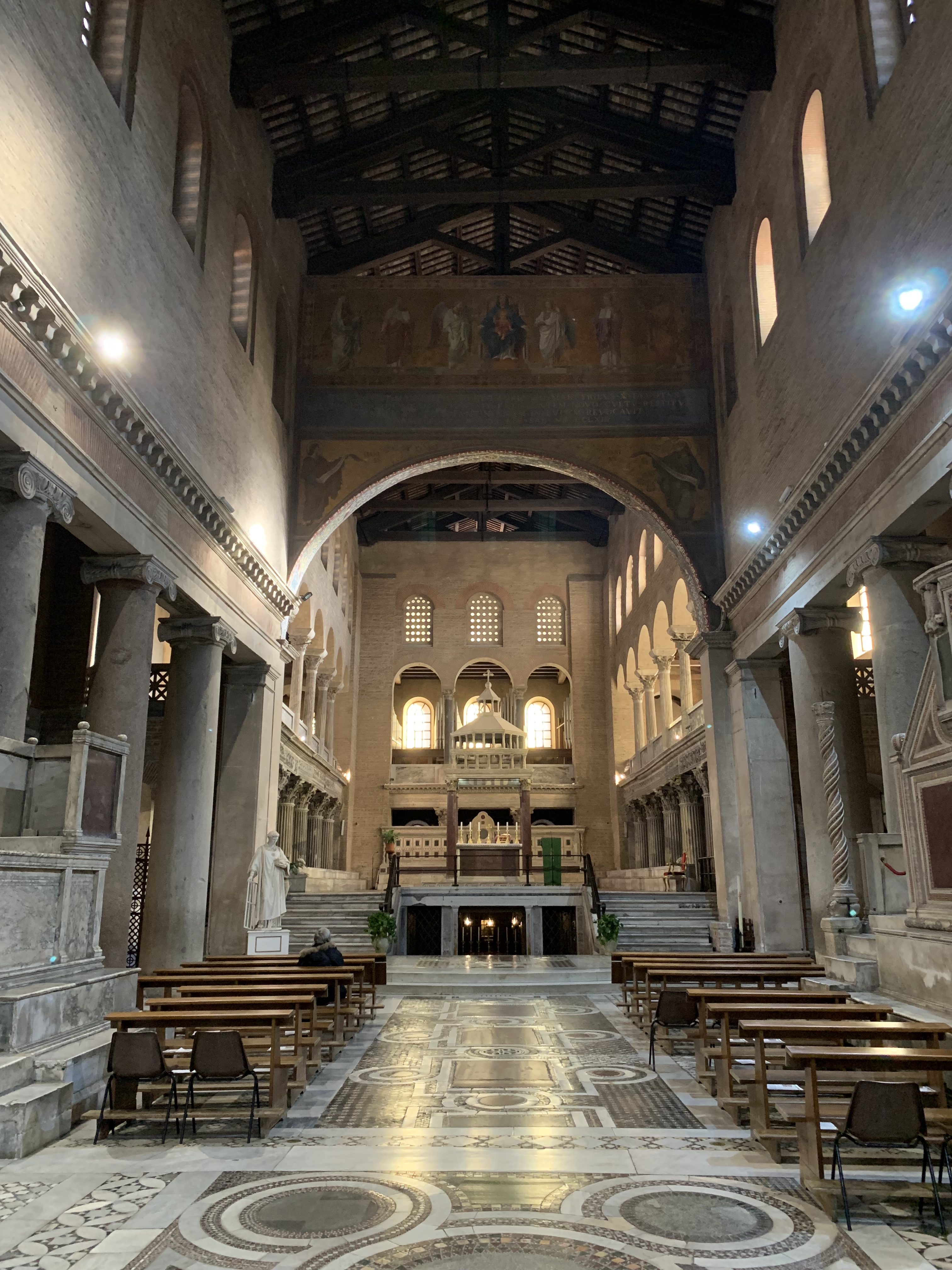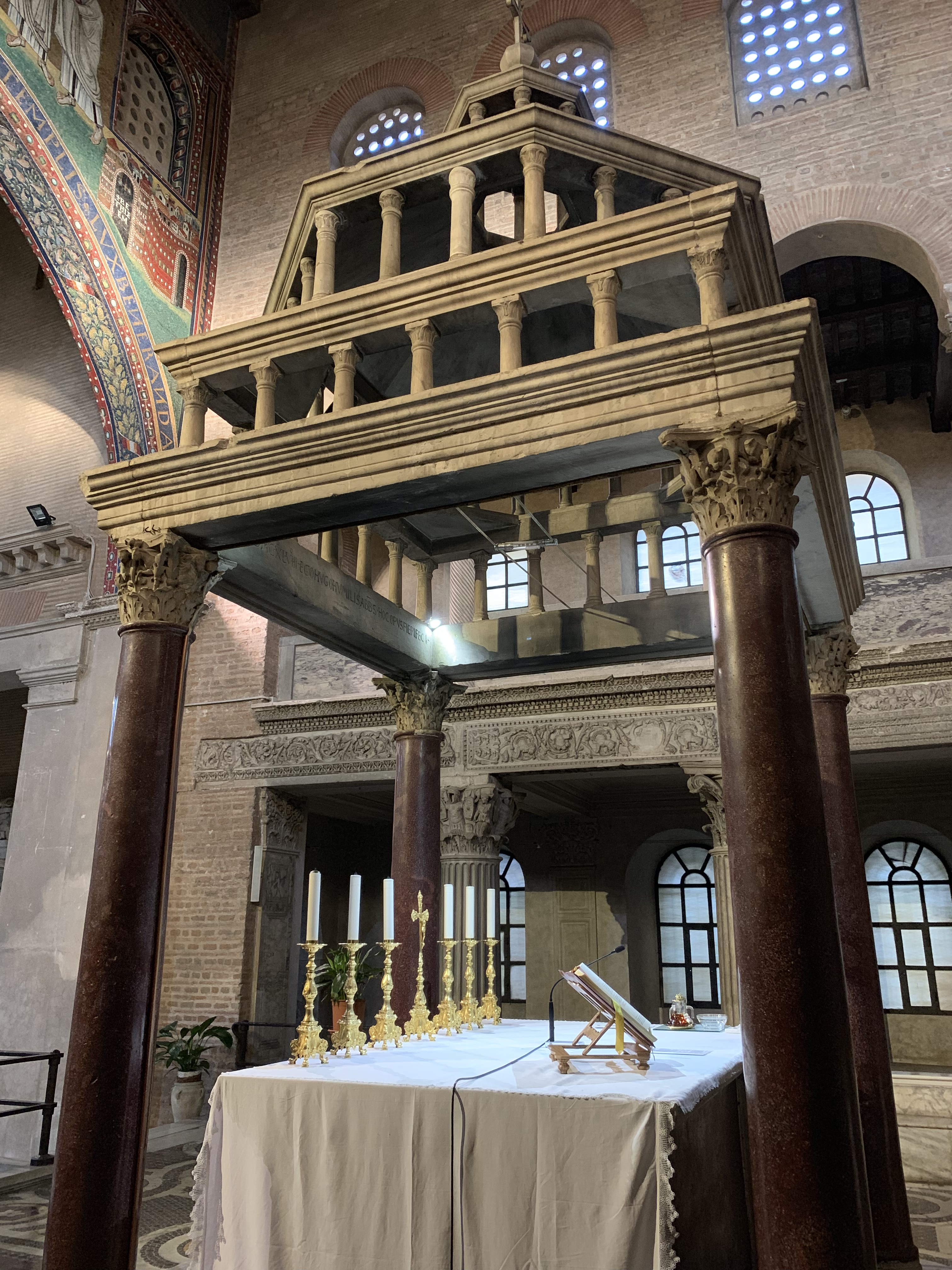 On the triumphal arch are Byzantine mosaics from the 6th century, depicting Christ with saints. The confessio below the high altar is entered from the nave. Here, St. Lawrence and St. Stephen are enshrined. The latter was transferred from Constantinople by Pope Pelagius II during his restoration of the Basilica. Behind the high altar is a Papal altar with an inscription of the names of the makers, namely the Cosmati family, and dating it to 1148.