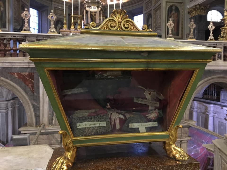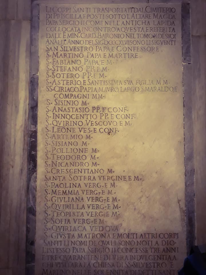 The interior has a nave and two aisles, divided by ancient columns. A votive lamp, made in silver sheet and housed in the sacristy, was believed to be St. Sylvester’s tiara. Under the major altar are preserved the relics of Saints Artemius, Paulina and Sisinnius, brought here from the Catacomb of Priscilla. A mosaic portraying Madonna with St Sylvester is from the 6th century.