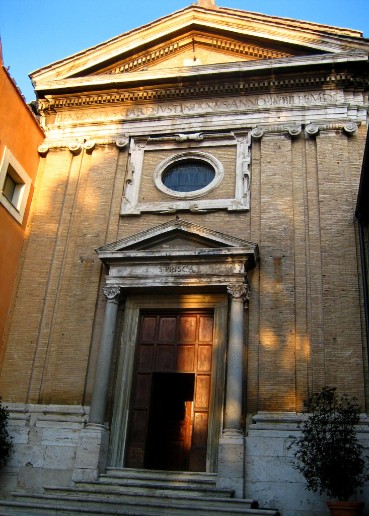 It is devoted to Saint Prisca, a 1st-century martyr, whose relics are contained in the altar in the crypt. It was built in the 4th or 5th century over a temple of Mithras. Damaged in the Norman Sack of Rome, the church was restored several times. The current aspect is due to the 1660 restoration, which included a new facade by Carlo Lombardi. In the interior, the columns are the only visible remains of the ancient church.