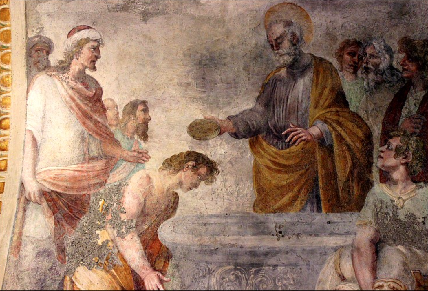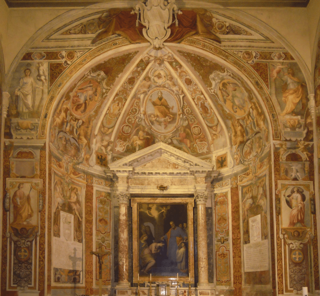Also a baptismal font is conserved that by tradition was used by Saint Peter. The frescoes in the crypt, where an altar contains the relics of Saint Prisca, are by Antonio Tempesta. Anastasio Fontebuoni frescoed the walls of the nave with Saints and angels with the instruments of passion. In the sacristy hangs a painting of the Immaculate conception with angels by Giovanni Odazzi, and on the main altar a Baptism of Santa Prisca by Domenico Passignano.