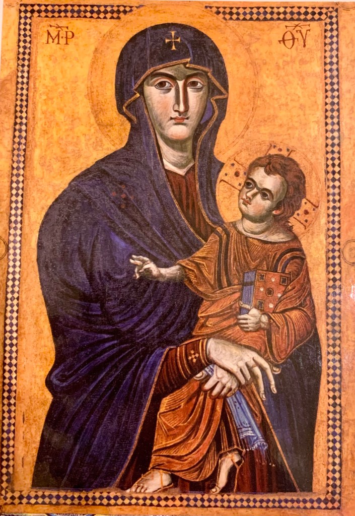 The folded together position of Mary’s hands distinguishes this image as a version of the earlier type from before the development of the types of iconography, where Mary points to Christ with her right hand. Rather than offering the Child, she keeps his body closer to hers and seeks physical and contact with Him.