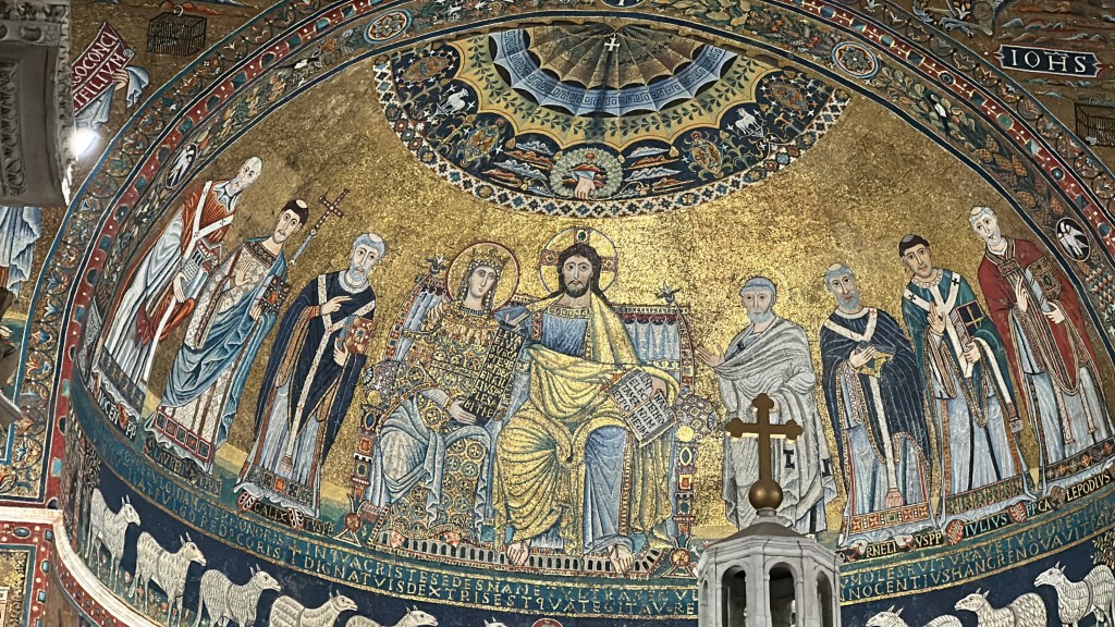 The Basilica’s structure, divided into three sections, showcases medieval mosaics, the Mystic Lamb flanked by twelve sheep, and a stunning depiction of Christ crowning the Virgin. Notably, Cavallini’s 13th-century mosaics depict the life of the Virgin, representing a radical departure from Byzantine art to an emerging Italian style.