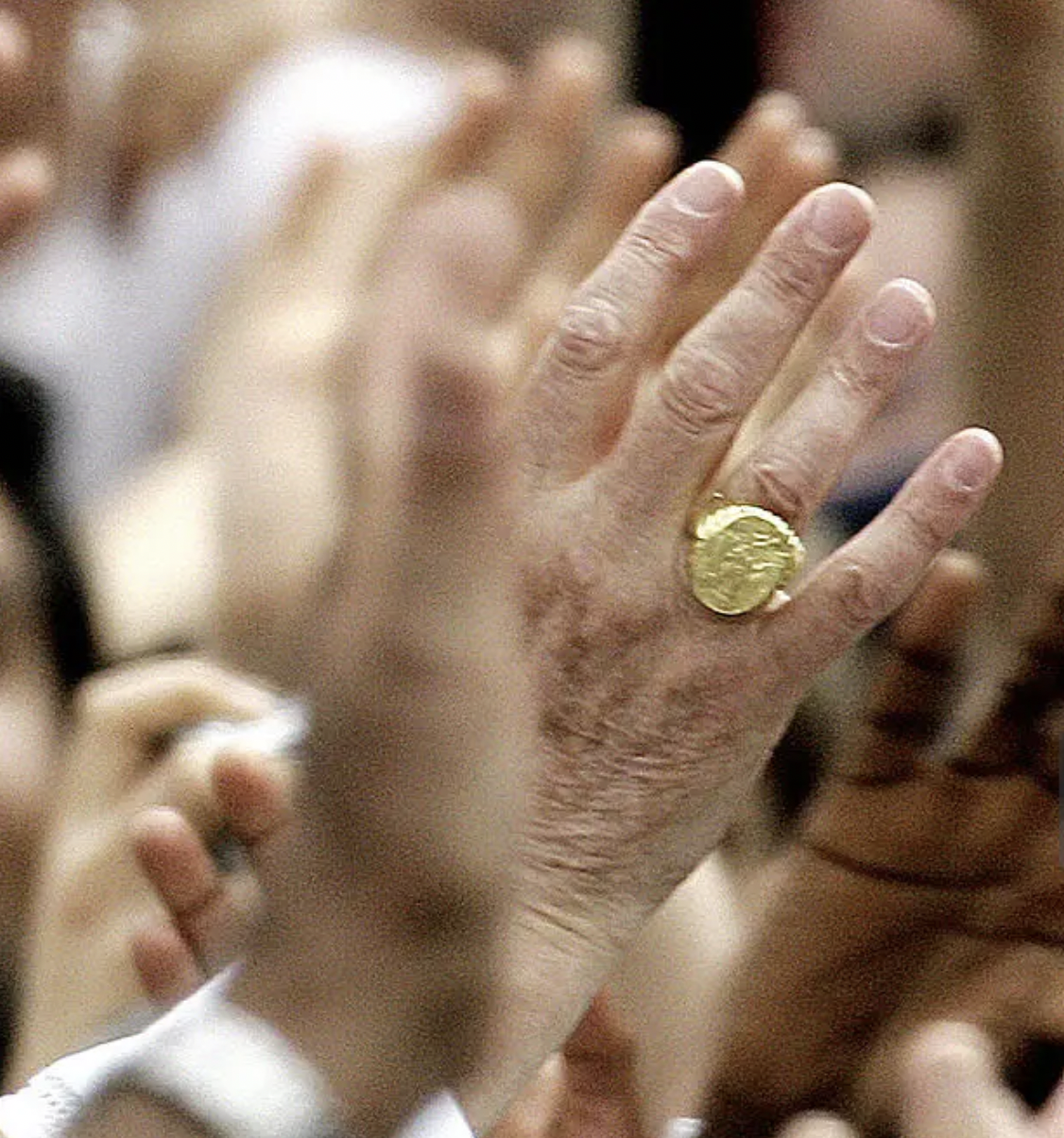 Photo credit: VATICAN CITY, Vatican: The hand of Pope Benedict XVI wearing the Fisherman’s Ring is seen as he waves to the crowd from his papamobile after celebrating mass in St Peter’s Square at the Vatican 24 April 2005. PAOLO COCCO/AFP via Getty Images