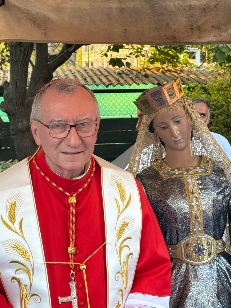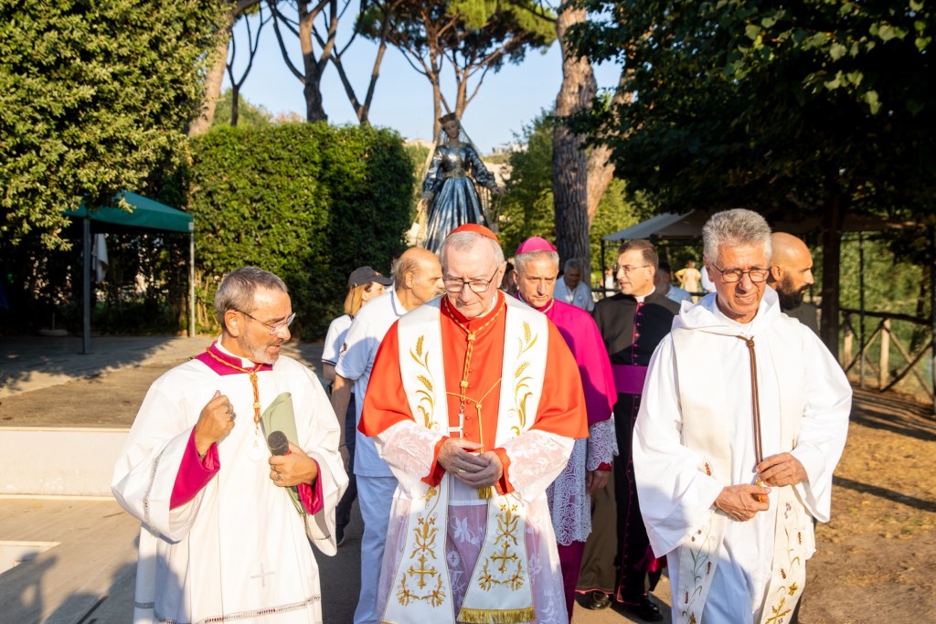 The statue traveled from the Lazio Rowing Club down the Tiber River on a boat with Cardinal Pietro Parolin, Vatican Secretary of State; Mons. Viola, Secretary of the Dicastery of Divine Worship and Discipline of the Sacraments; and, Mons. Di Tolve, auxiliary bishop of Rome.