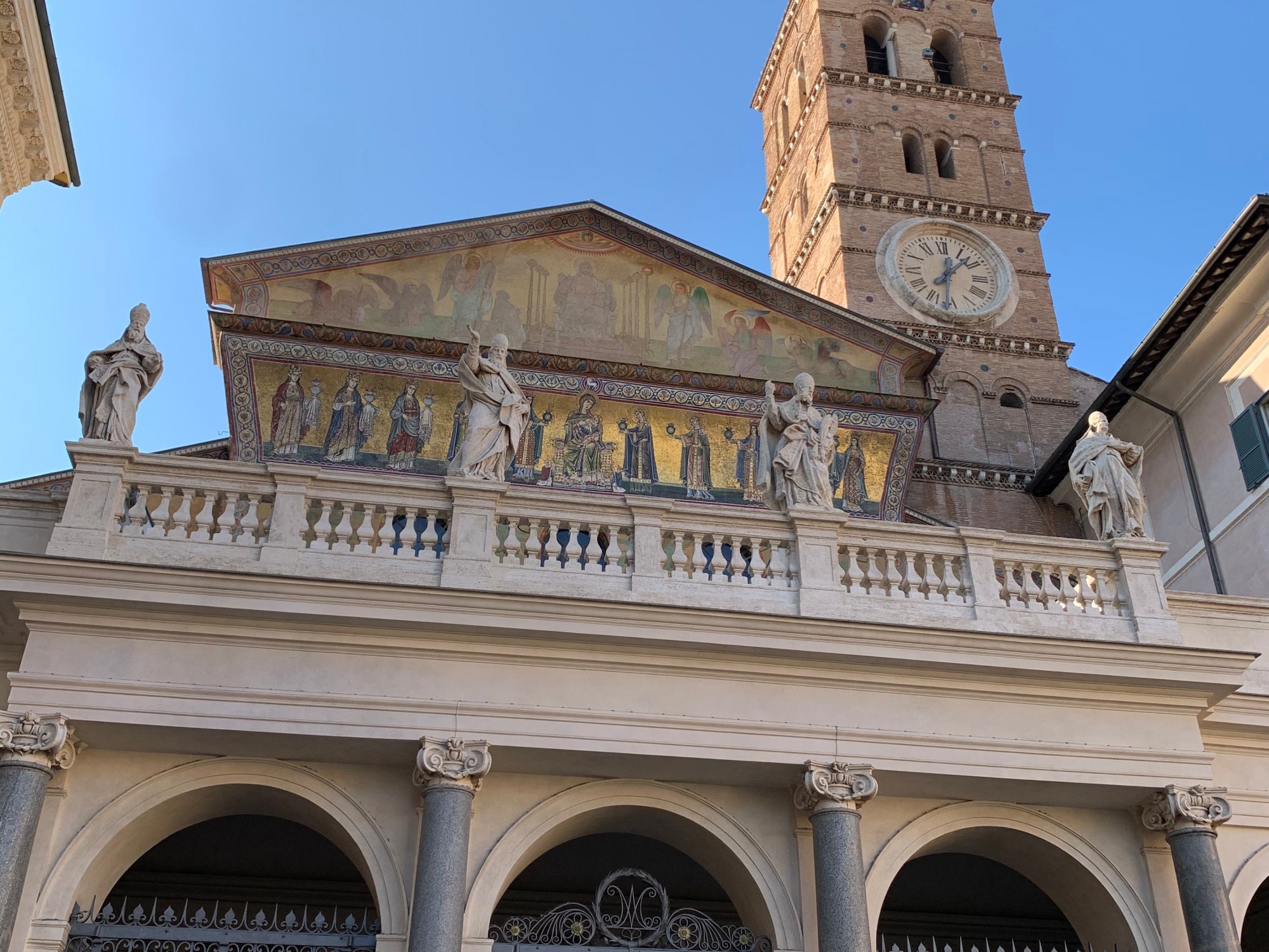The façade also displays a medieval mosaic showing the Virgin enthroned with the Child, reinforcing the church’s identity as one of Rome’s earliest Marian shrines.